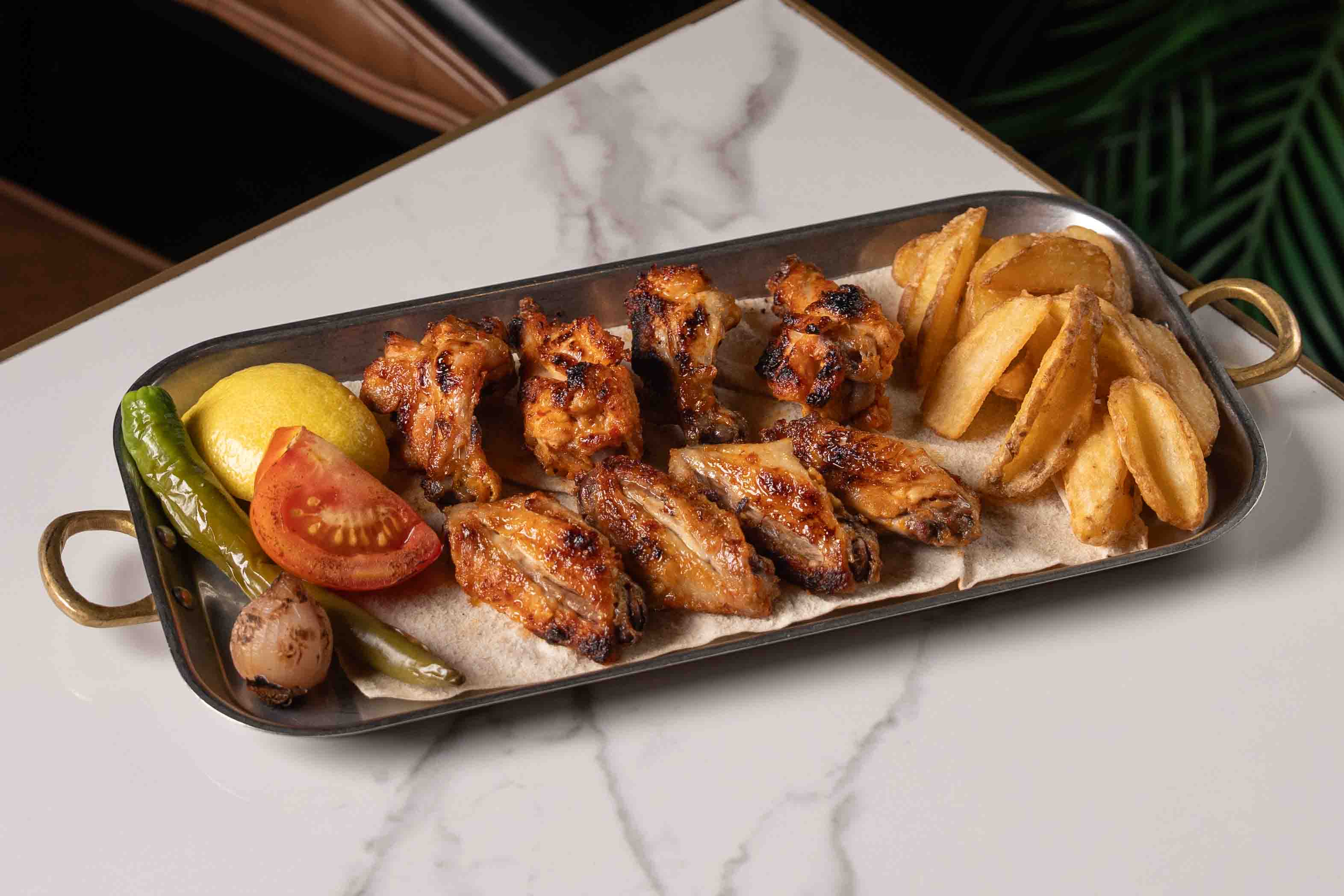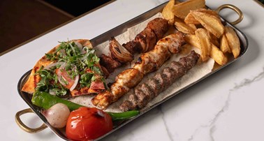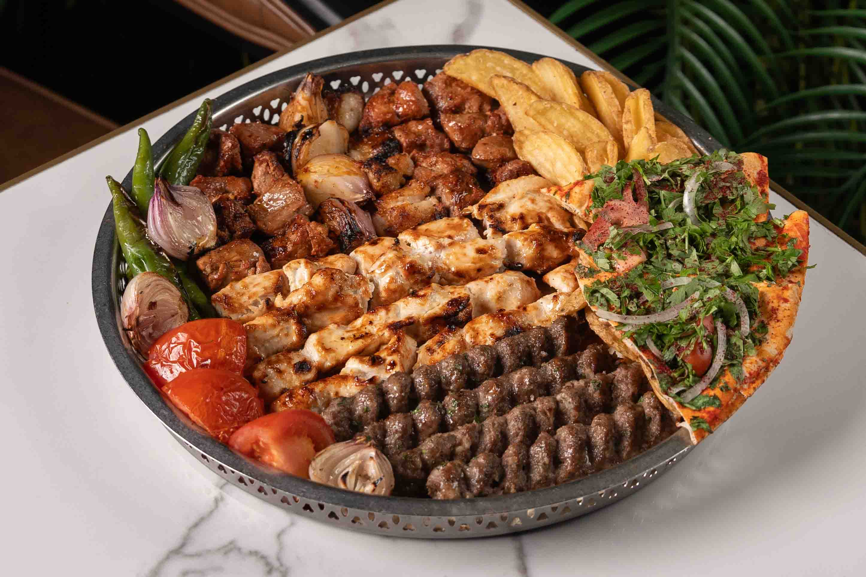 four skewers of each of tawouk, meat, and kafta with grilled vegetables and thick cut fries