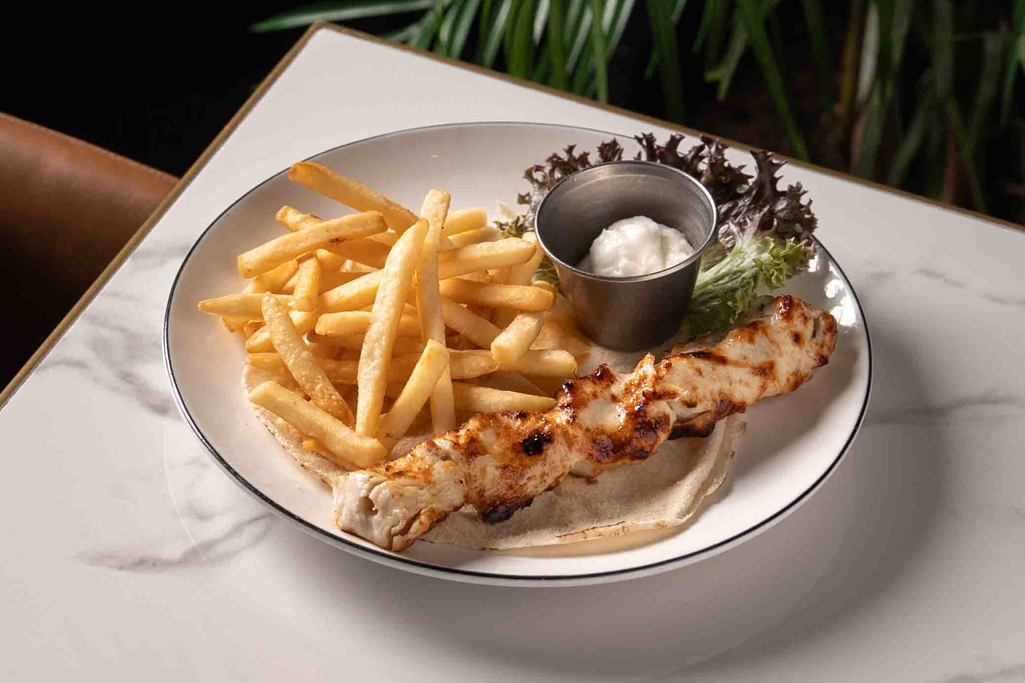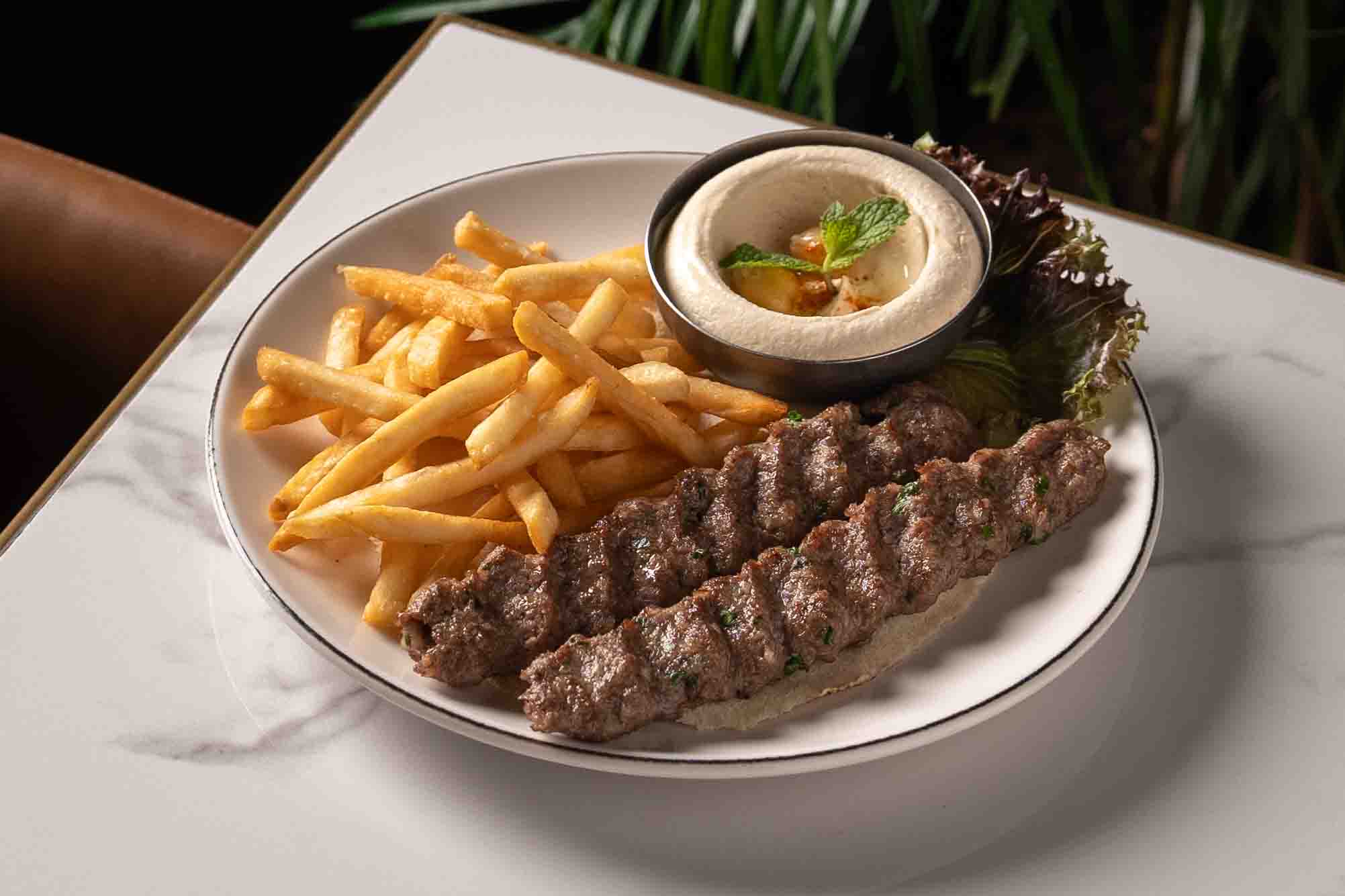 one skewer of each of tawouk, meat, and kafta with grilled vegetables and thick cut fries
