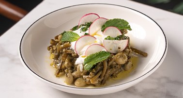 (for 2) eggs your way coupled with labneh, kashkaval cheese, feta cheese, eggplant fatteh, hummus, foul, vegetable platter, fig jam, carob molasses & halawa served with 2 hot beverages of your choice; Lebanese coffee or tea