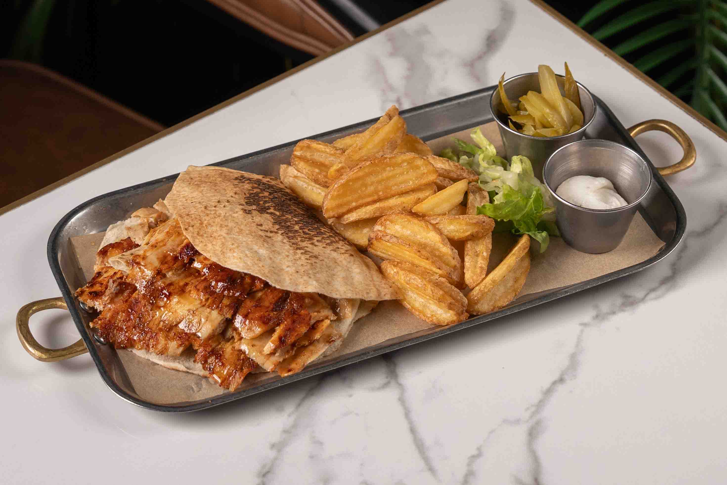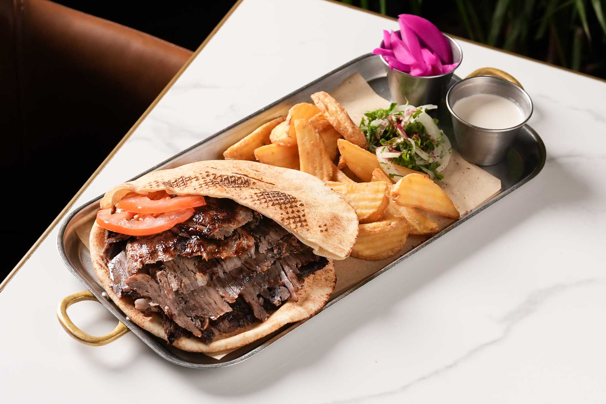 one skewer of each of tawouk, meat, and kafta with grilled vegetables and thick cut fries