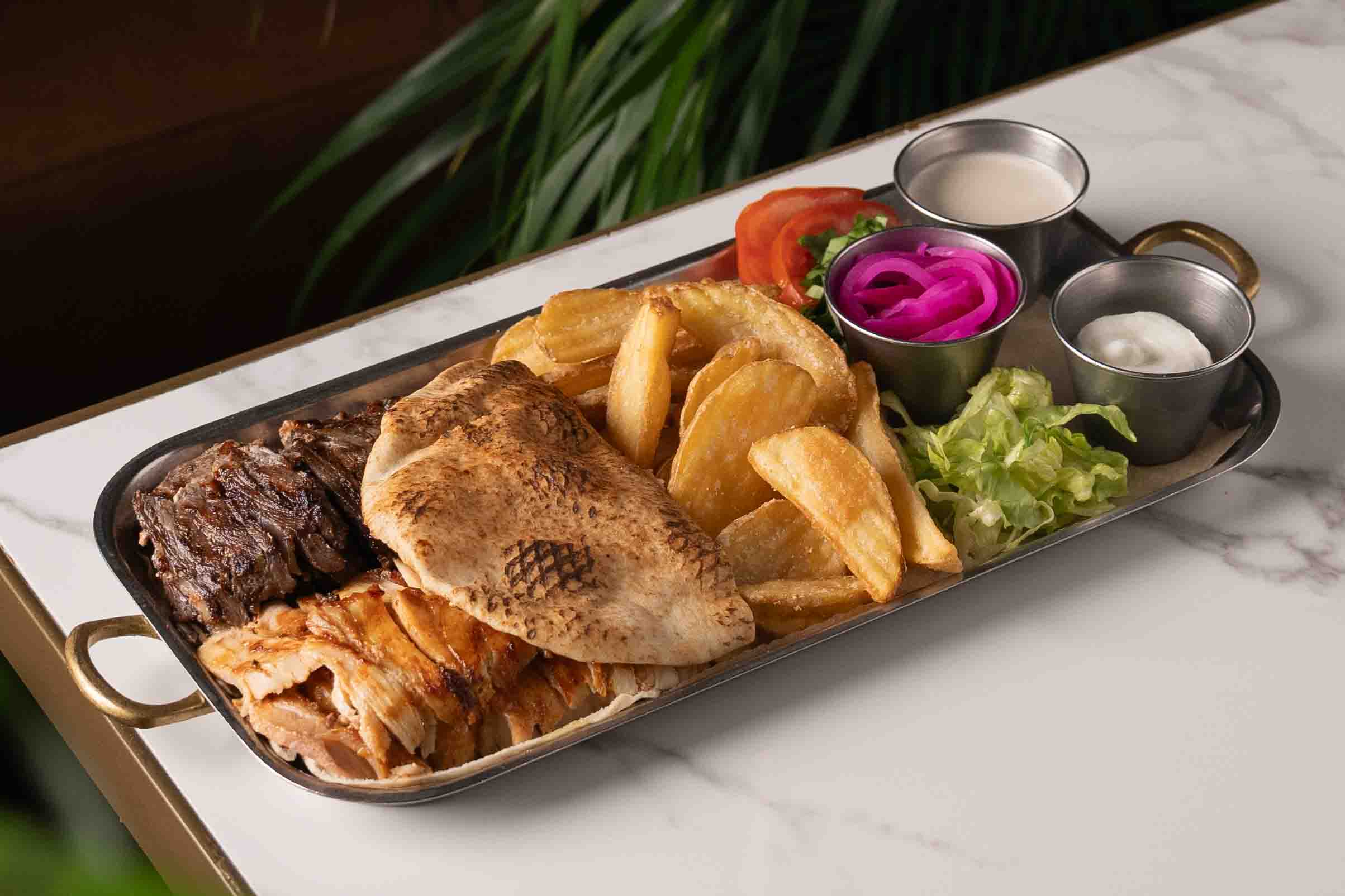 two skewers of each of tawouk, meat, and kafta with grilled vegetables and thick cut fries