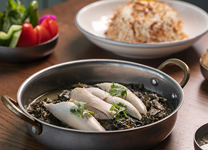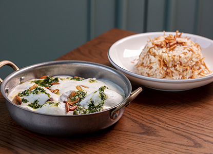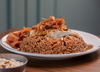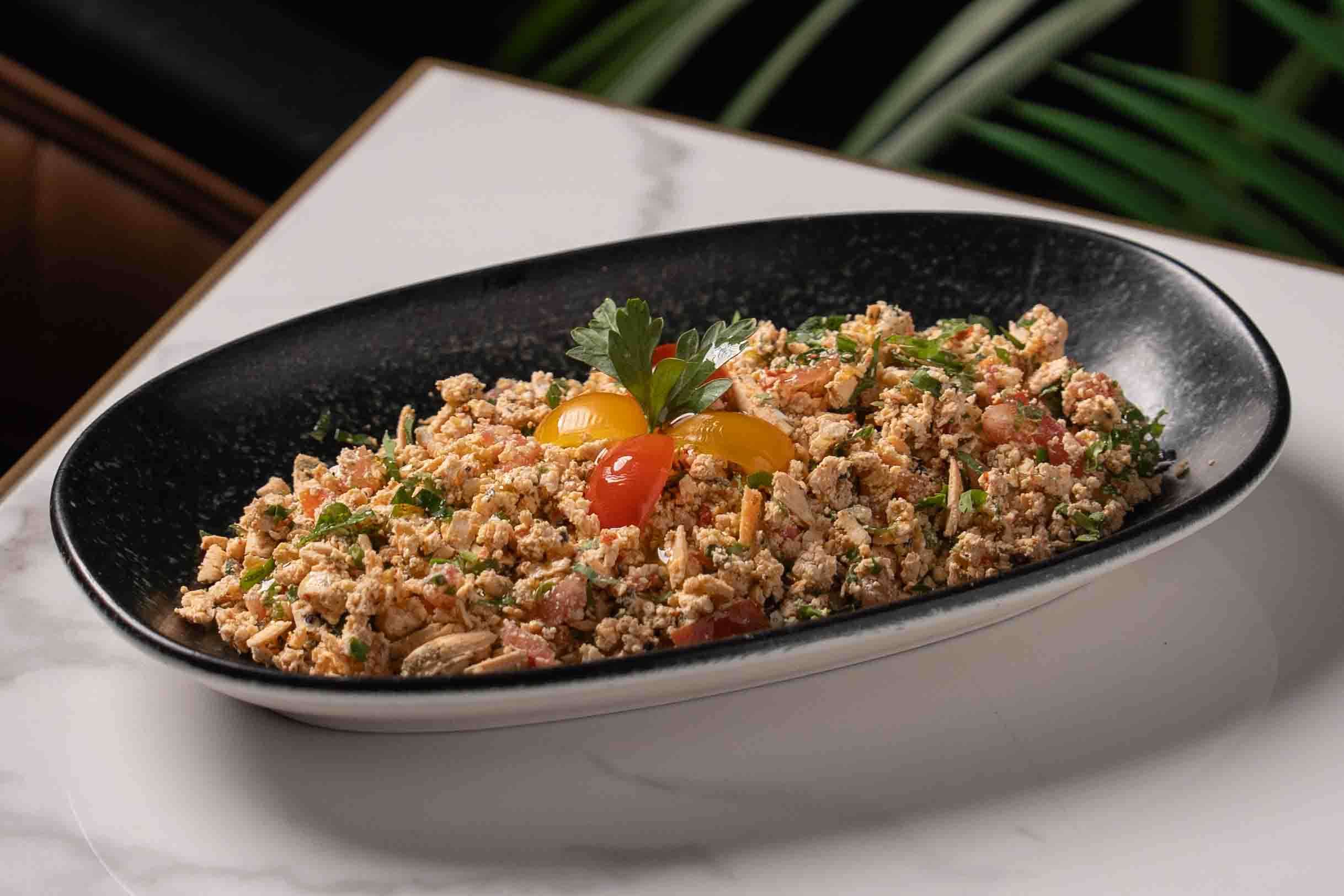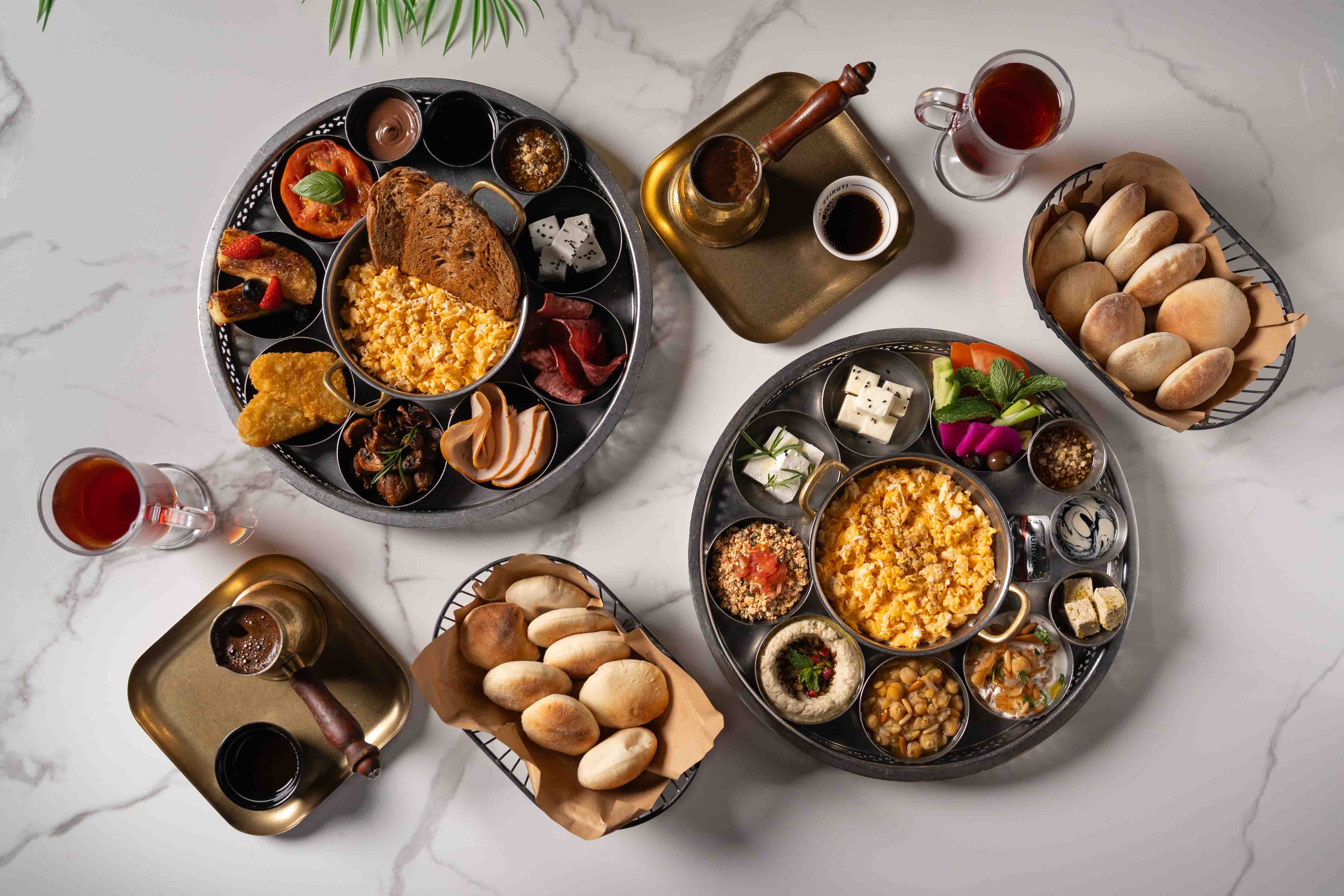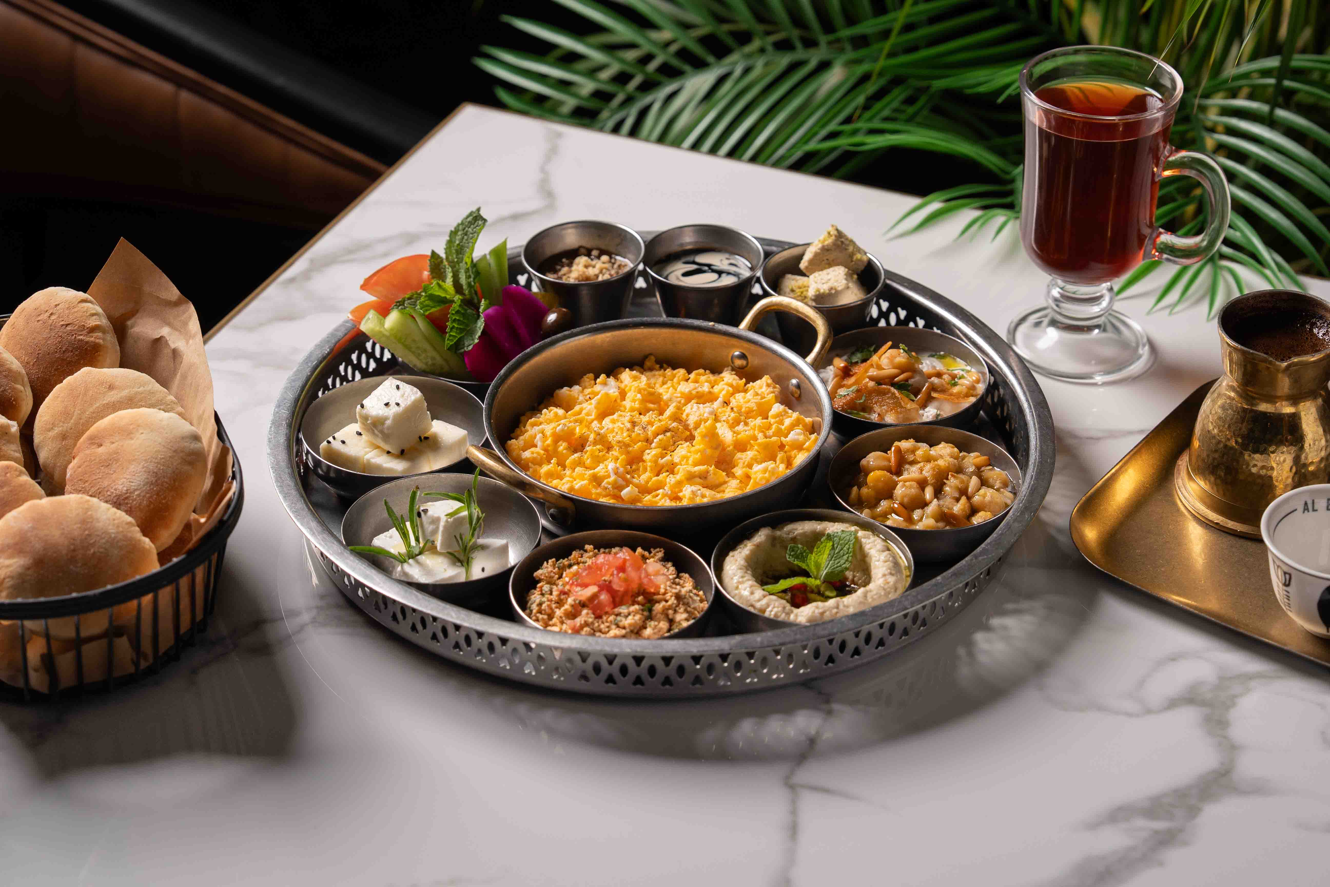 (for 2) eggs your way coupled with shanklish, halloumi, nabulsi cheese, hummus fatteh, moutabal, balila, vegetable platter, figs jam, carob molasses & halawa served with 2 hot beverages of your choice; Lebanese coffee or tea