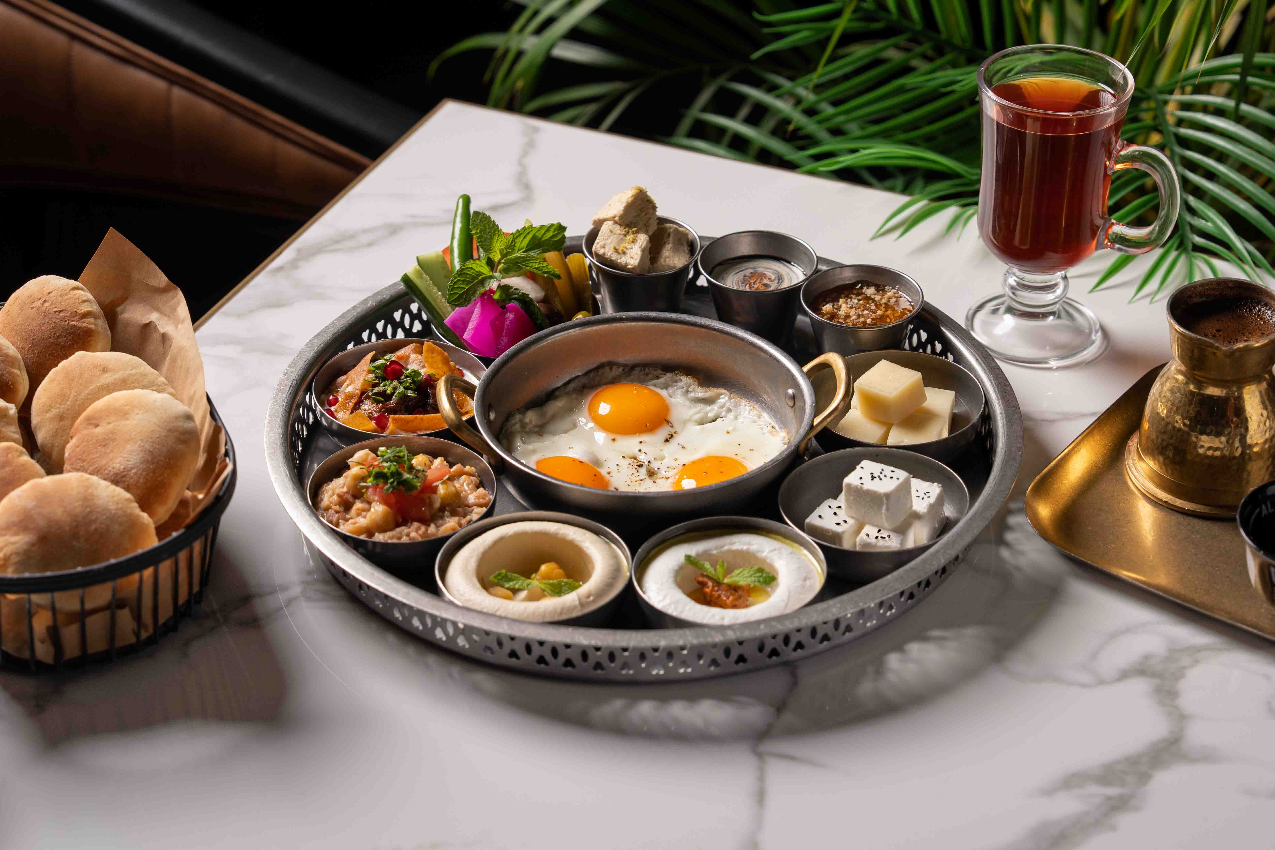 (for 2) eggs your way coupled with labneh, kashkaval cheese, feta cheese, eggplant fatteh, hummus, foul, vegetable platter, fig jam, carob molasses & halawa served with 2 hot beverages of your choice; Lebanese coffee or tea
