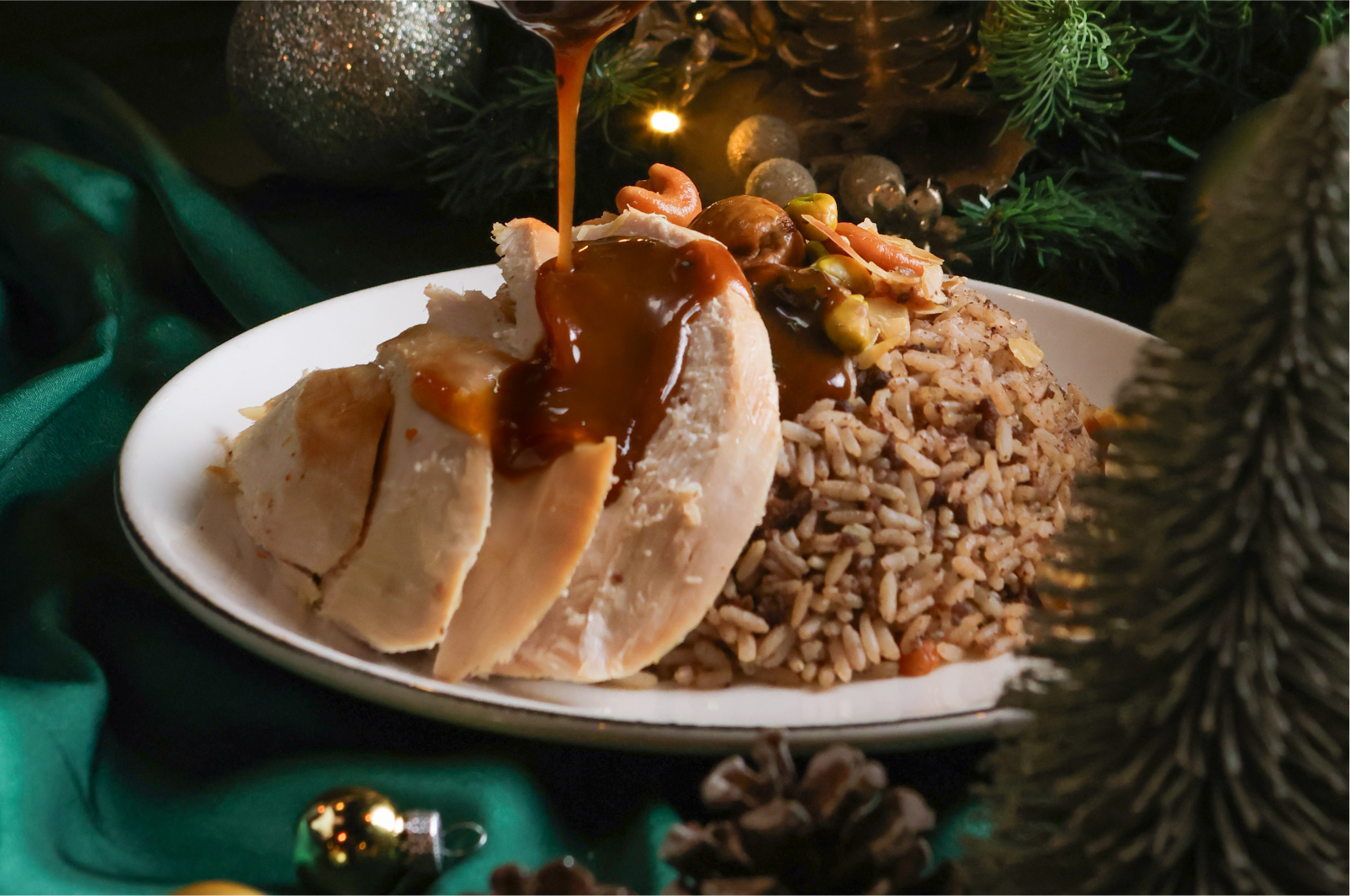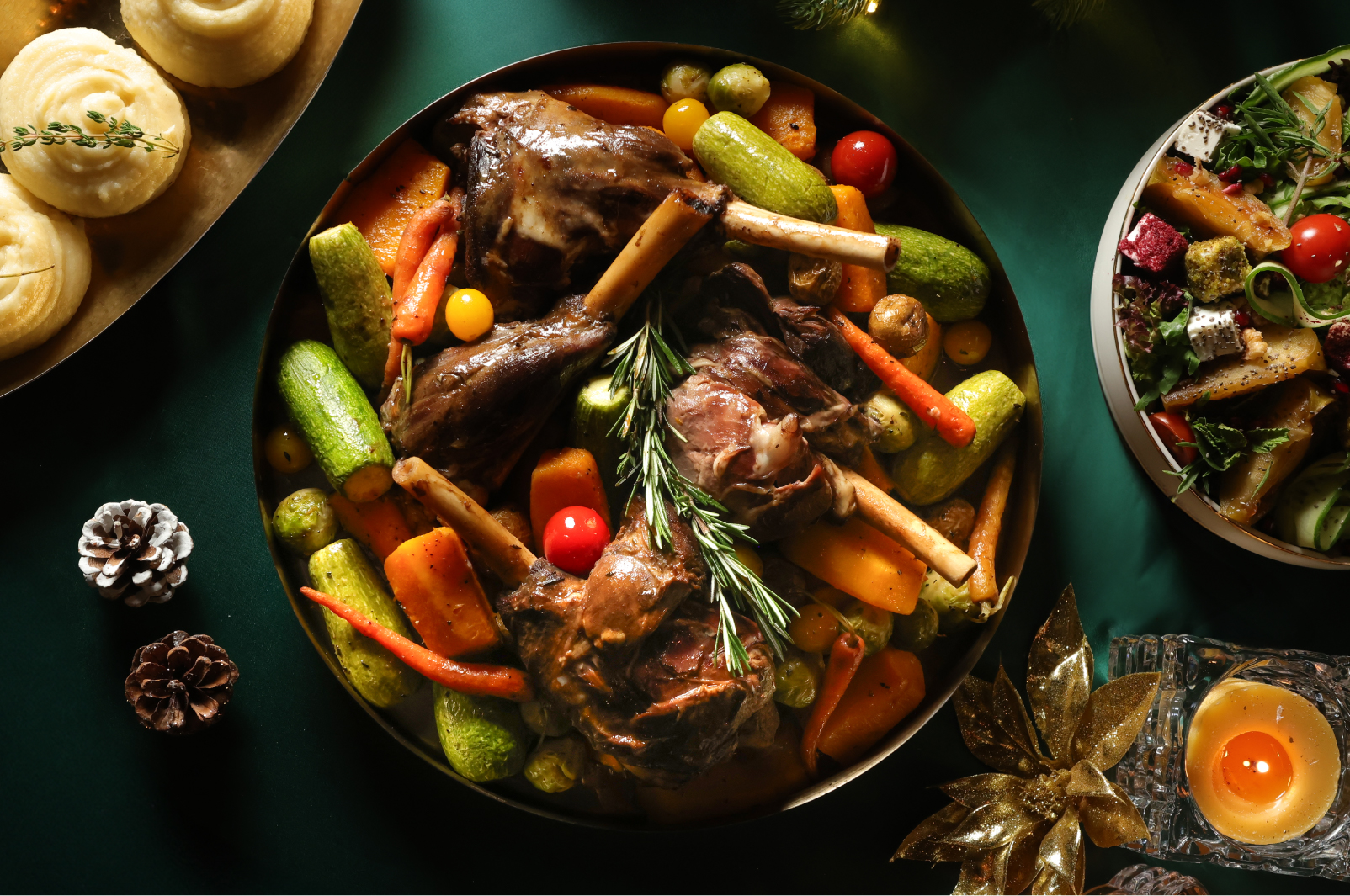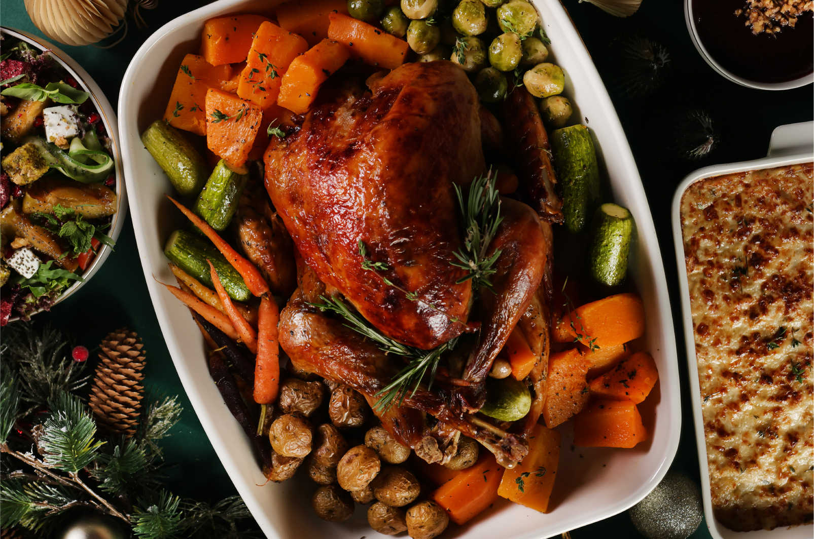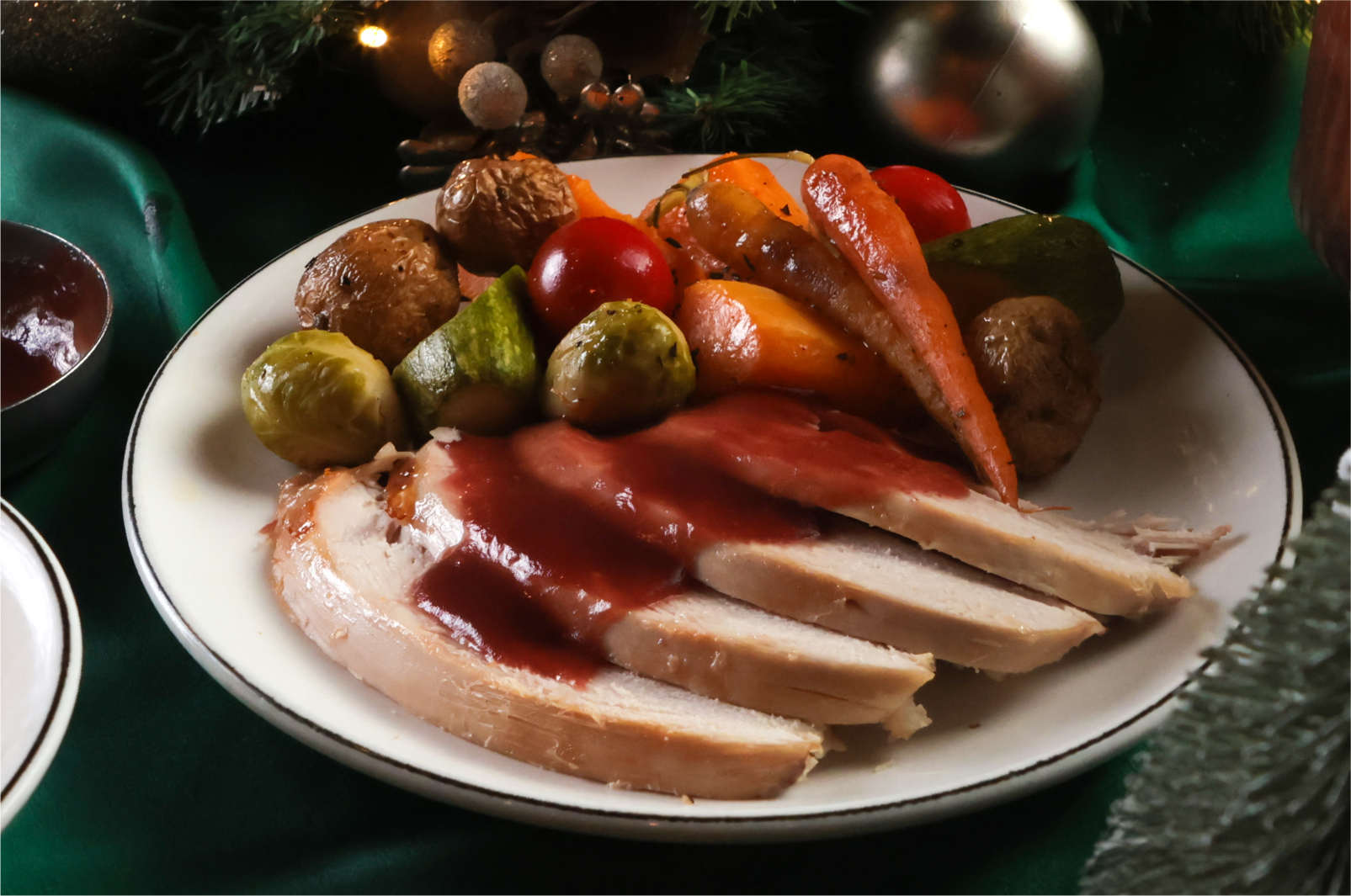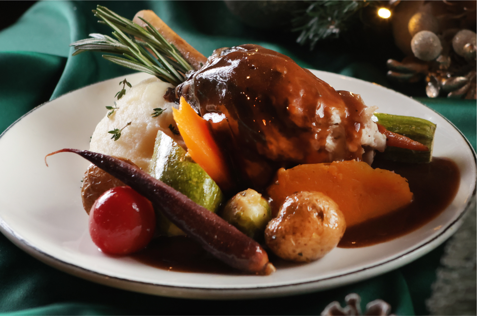 Served with roasted vegetables, gravy and mashed potatoes